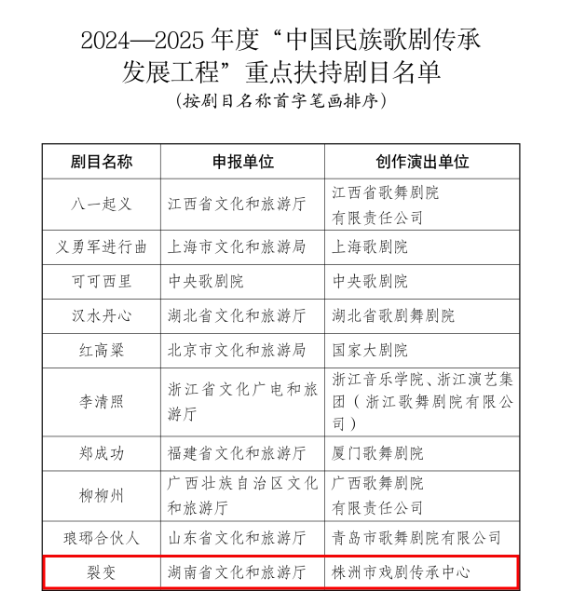 日前,文化和旅游部办公厅发布2024—2025年度“中国民族歌剧传承发展工程”重点扶持剧目名单,由市戏剧传承中心创作演出的中国工业题材民族歌剧《裂变》名列其中。