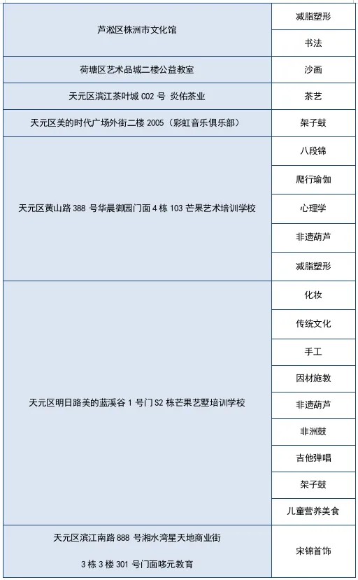 株洲市文化馆2025市民夜校联合社会机构新增6个馆外教学点位,新增课程17门,总共7个教学点计划开设课程20门。