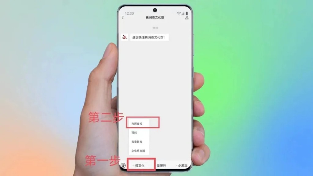 打开微信,关注株洲市文化馆公众号,点击进入公众号主页。